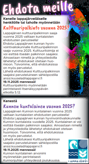 Lappajärven kulttuuripalkinnon saaja vuonna 2025 valitaan kuntalaisten ehdotusten perusteella! Ehdota Lappajärven kunnan hyvinvointivaliokunnalle Kulttuuripalkinnon saaja vuonna 2025. Kulttuuritoimija ei voi esittää itseään palkinnon saajaksi. Ainoastaan nimellä ja yhteystiedoilla lähetetyt ehdotukset otetaan huomioon. Toivomme, että ehdotuksissa on myös perustelut. Lähetä ehdotuksesi Kulttuuripalkinnon saajaksi perusteluineen sähköpostilla anssi.kuusela@lappajarvi 19.11.2025 mennessä! Kulttuuripalkinto myönnetään perinteisesti itsenäisyyspäivän Etko-juhlallisuuksien 5.12.