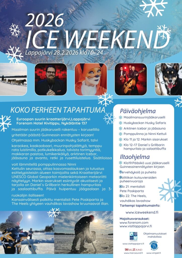 Ohjelmassa mm. Huskybackan Husky Safarit, talvikaraokea, kaakaobaari, muurinpohjalättyjä, temppurata luistimilla, potkukelkkailua, talvista torimyyntiä, makkaran paistoa, lumikenkäilyä, arktinen Icebar, jääsauna ja avanto, retki- ja rusettiluistelua.