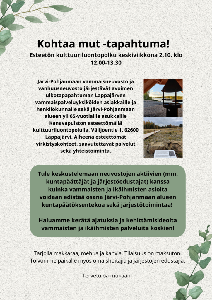 Järvi-Pohjanmaan vammaisneuvosto ja vanhuusneuvosto järjestävät avoimen ulkotapapahtuman Lappajärven vammaispalveluyksiköiden asiakkaille ja henkilökunnalle sekä Järvi-Pohjanmaan alueen yli 65-vuotiaille asukkaille Kanavapuiston esteettömällä kulttuuriluontopolulla, Välijoentie 1, 62600