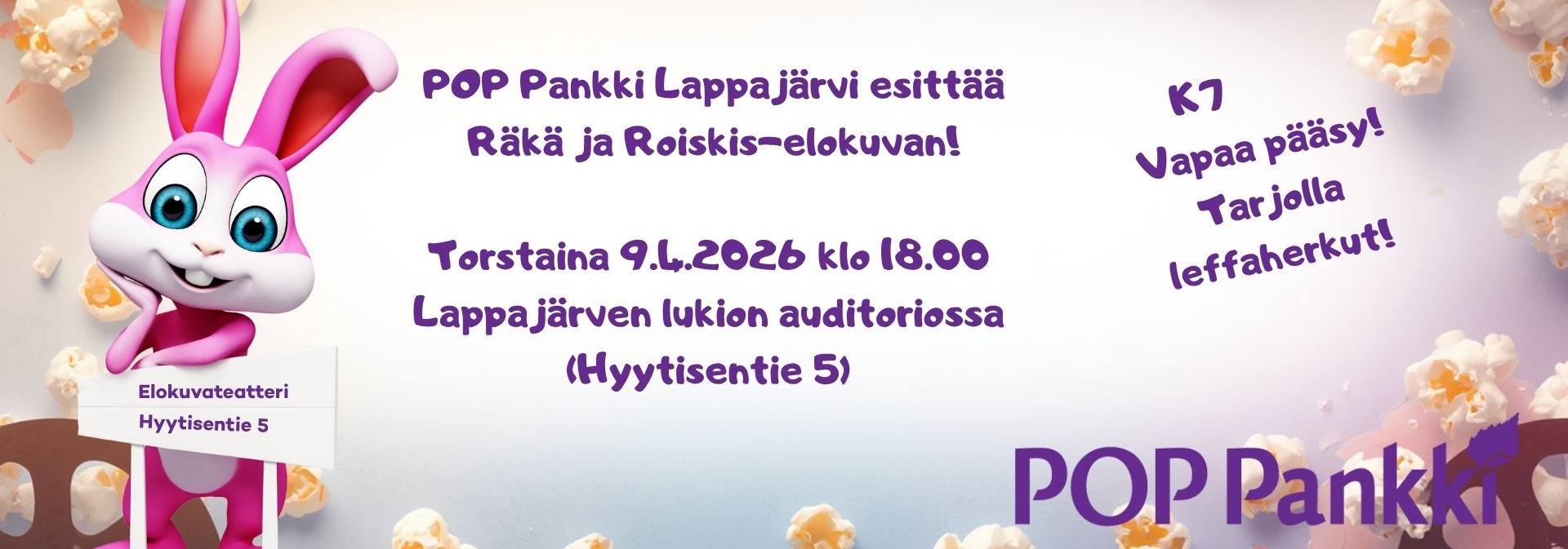 Tapahtumaan on vapaa pääsy, ja POP Pankki tarjoaa elokuvaherkut kaikille osallistujille.
